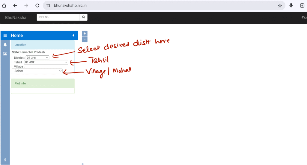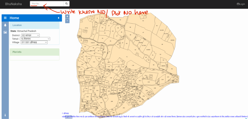 To search your khasra and plot in this village map, you have to write the plot and khasra number in the search bar and click here.