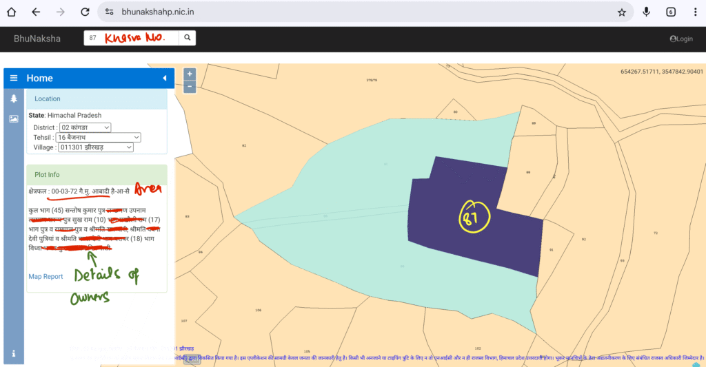 As we have entered khasra number 87 here and gotten the below-given information, the blue area that is searched is the khasra number, and the surrounding sky blue area means the owners are the same. On the left-hand side, you will get the entire information regarding the measurement of the area and the details of the owners.